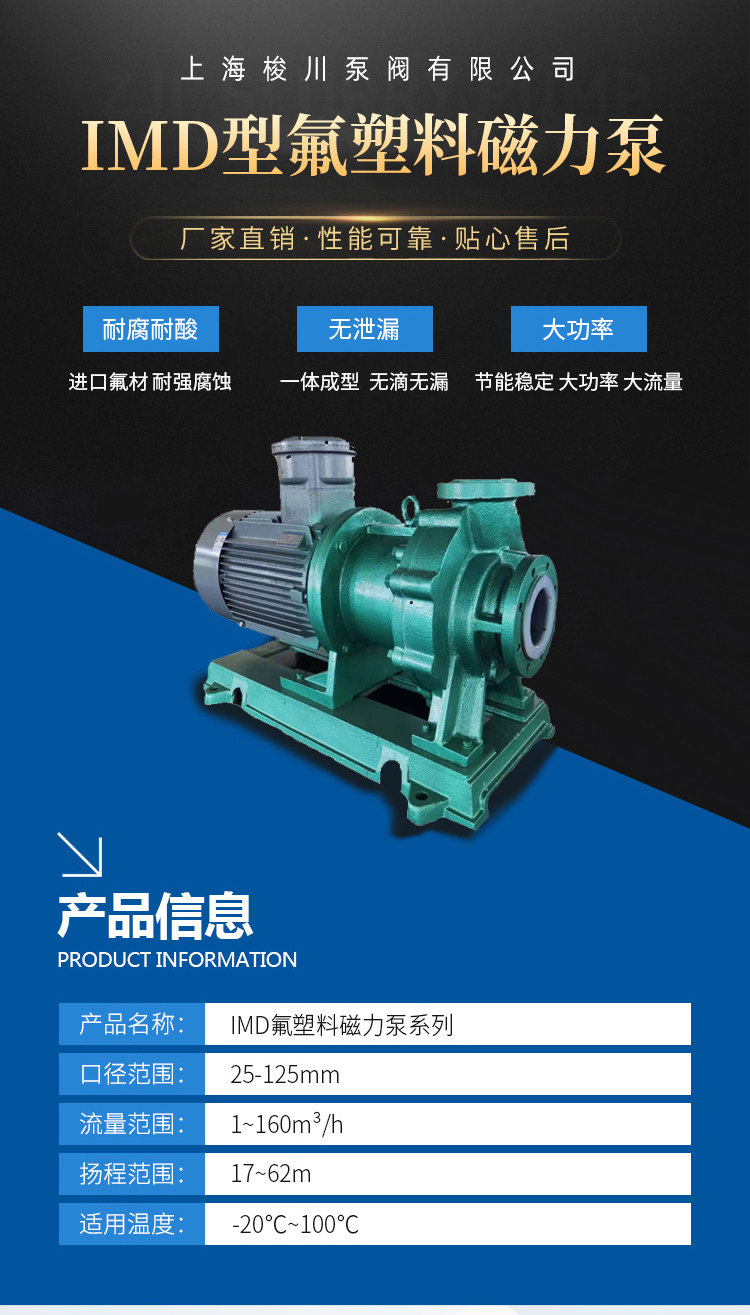 IMD系列磁力泵,適用于輸送強腐蝕,易燃、易爆、有毒、易揮發的化學介質。適用溫度:-20℃~100℃