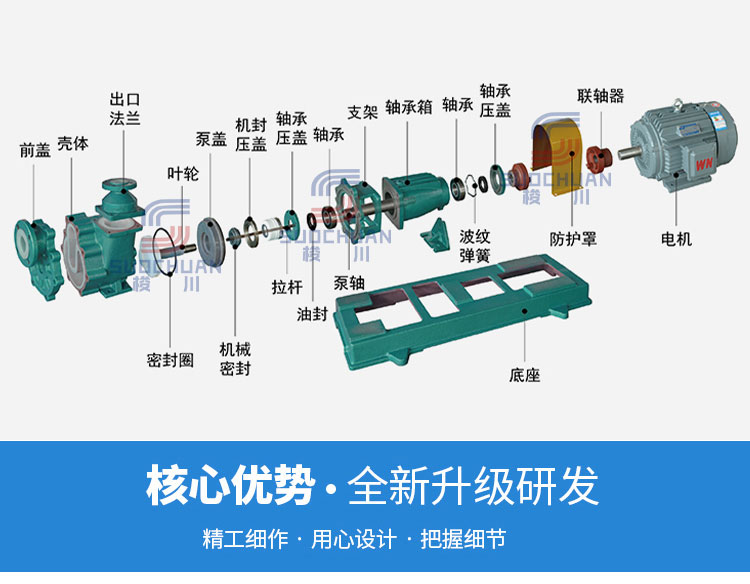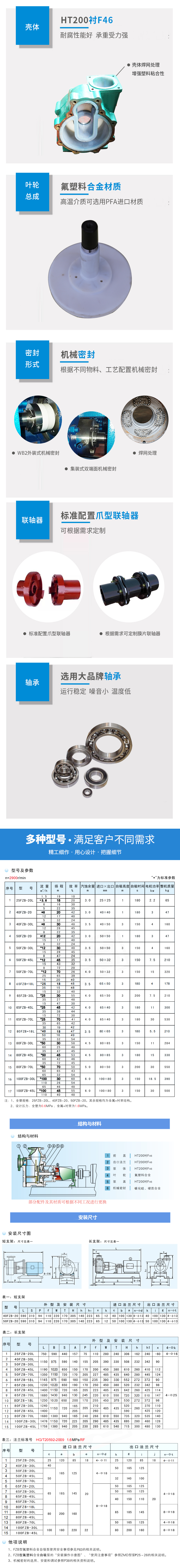 過流部件采用氟塑料、氟塑料合金制造,耐腐蝕性能優異。基體采用金屬材料制造,耐壓能力強。